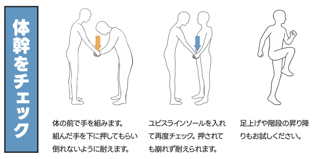体幹が機能すれば、立位、座位などの姿勢保持や荷物を持ち上げる際の腰への負担、電車やバスの揺れに対応しやすくなるなど、生活のさまざまな場面での安定感に繋がります。